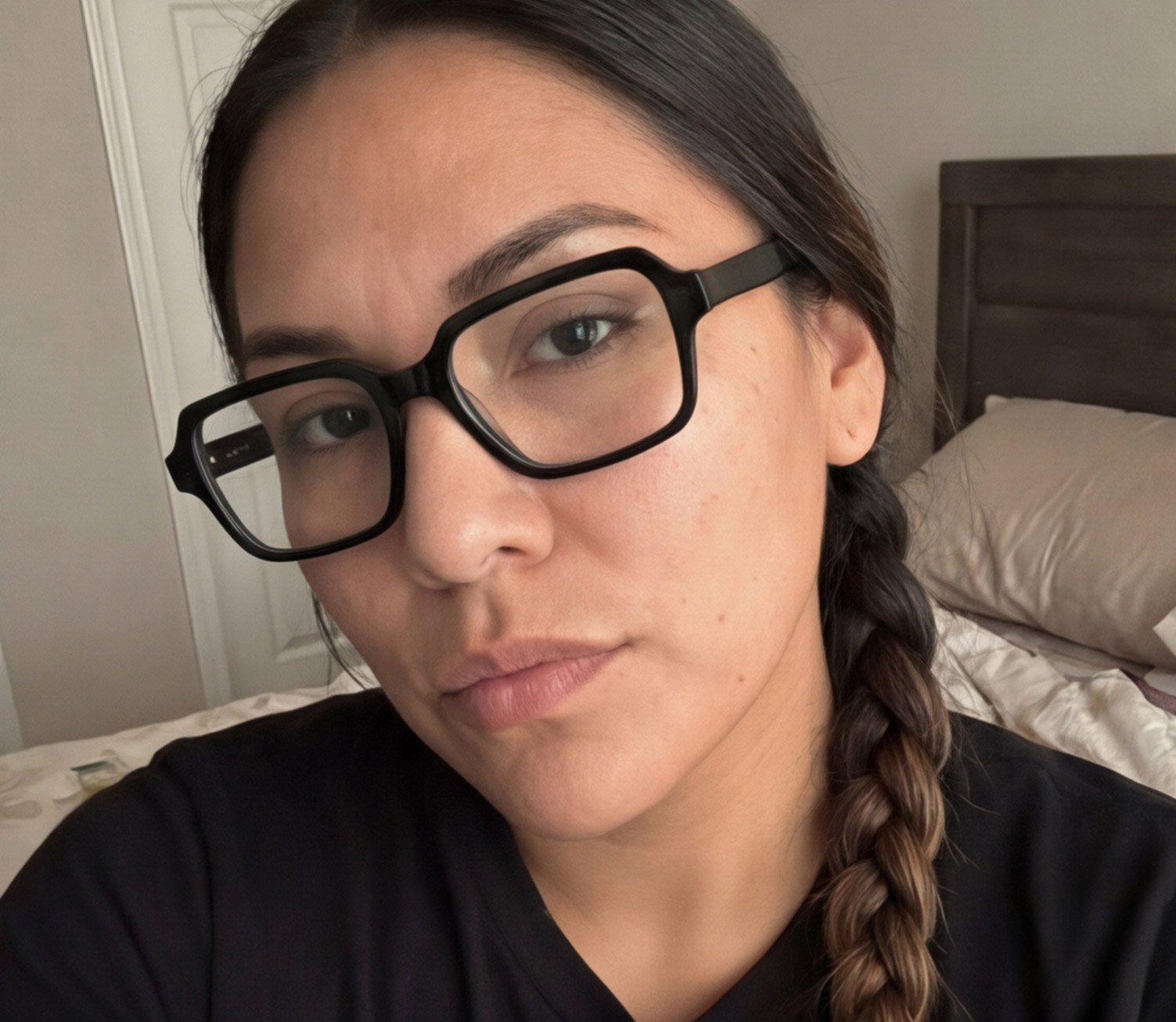 This pair of glasses with a unique black frame is mainly characterized by a neat square outline, and there are subtle geometric designs at the edges, breaking the monotony of a pure square. The pure black frame is simple and grand, but it shows personality and fashion due to the unique shape details. The wide frame can not only modify the face shape well but also add a sense of coolness and aura to the overall look. It is very suitable for matching with casual clothes to create a trendy style or combining with formal clothes to show a different kind of capability, and easily becomes an eye - catching highlight in the look.